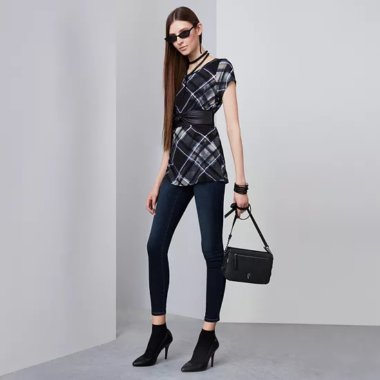 Feel comfortable and look cute in these women’s Simply Vera Vera Wang skinny jeans.