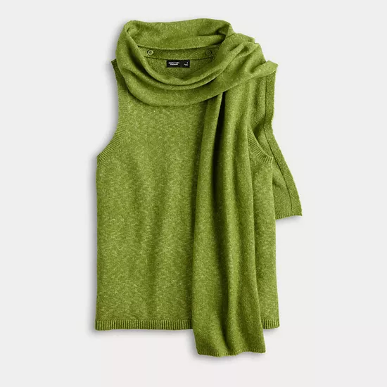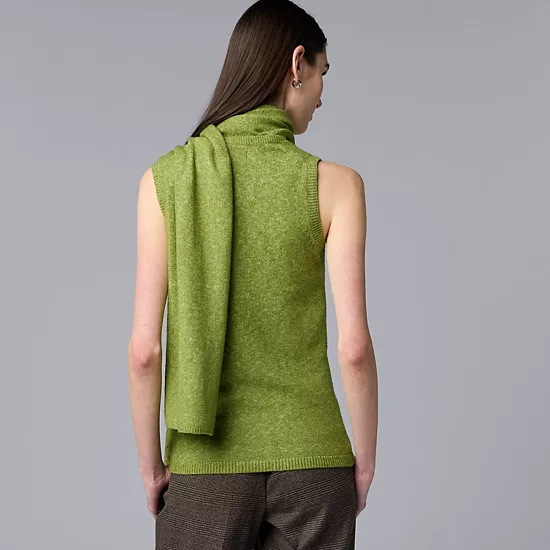 Chic and sophisticated, this sleeveless sweater top from Simply Vera Vera Wang brings effortless elegance to cooler days. Designed in a soft knit fabric, it features a unique built-in scarf detail that drapes gracefully across the shoulder for a modern twist. The mock neckline adds warmth and structure, while the clean silhouette makes it perfect for layering or wearing solo.