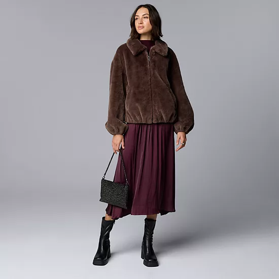 Step into style and warmth with this chic zip-front faux fur jacket from Simply Vera Vera Wang. Featuring convenient front pocket details, it’s perfect for layering over your favorite outfits while keeping you cozy and effortlessly fashionable throughout the season.